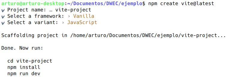 Para crear un nuevo proyecto con Vite ejecutaremos el comando npm create vite@latest. Después abriremos el directorio creado con Visual Studio Code y ejecutaremos npm install para instalar las dependencias.