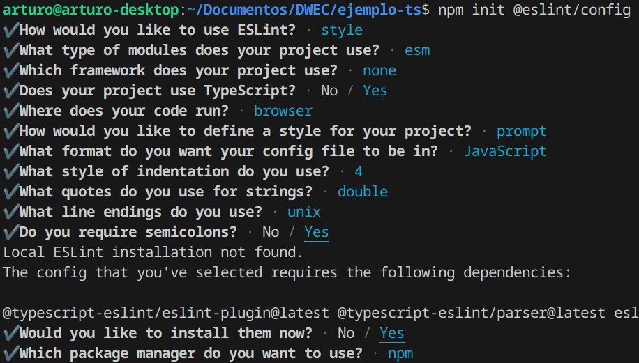 Instalamos eslint con npm init @eslint/config, y lo configuramos: